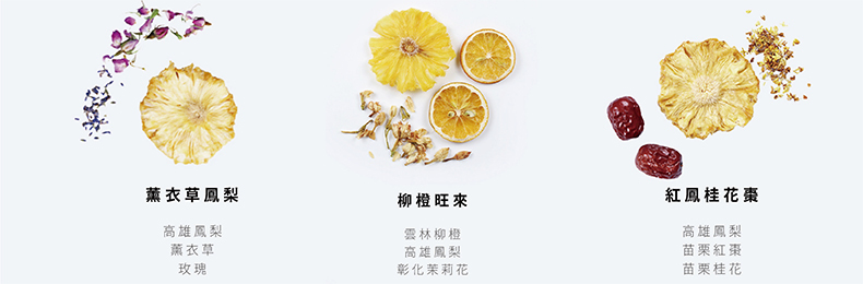 選用台灣在地水果 - 鳳梨、柳橙的清新與香甜,伴隨長時間烘製而成的果乾擁有細緻香氣,愈嚼愈感甜美, 搭配嚴選在地花卉與香草,於口中一齊綻放,只為讓每一位農夫辛勤耕耘,堅持無毒栽種的水果, 擁有更多層次的味覺體驗!
