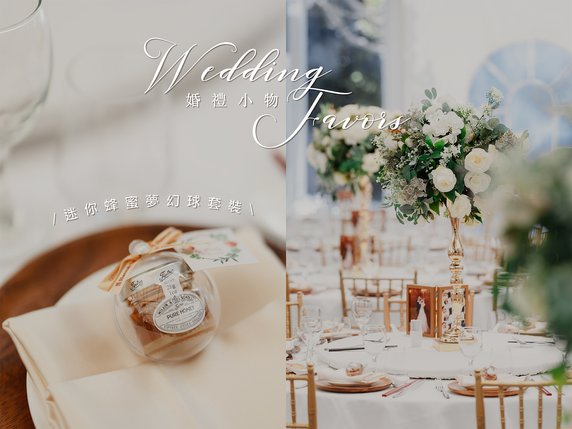 🍯蜂蜜喻意「甜甜蜜蜜」絕對是婚禮小物的首選 ,但只放著一樽迷你蜂蜜於餐枱上又稍為太單調,所以我們把蜂蜜放於壓克力夢幻球內,再配上精美的緞帶和小卡,立刻變得高貴了很多呢 😍